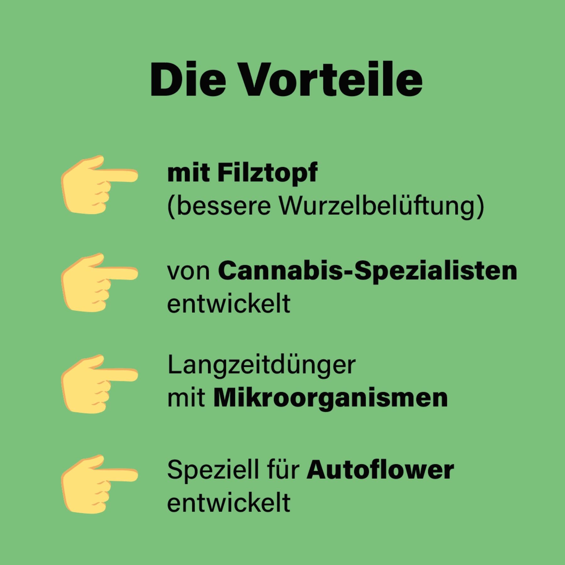 Darin kombiniert sind eine aktiv belebte Bio-Erde, nützliche Mikroorganismen, ein organischer Langzeitdünger und ein luftdurchlässiger Filztopf, der die Wurzeln optimal unterstützt. Alles ist perfekt aufeinander abgestimmt, sodass du ohne Stress zu einer vitalen Pflanze gelangst.